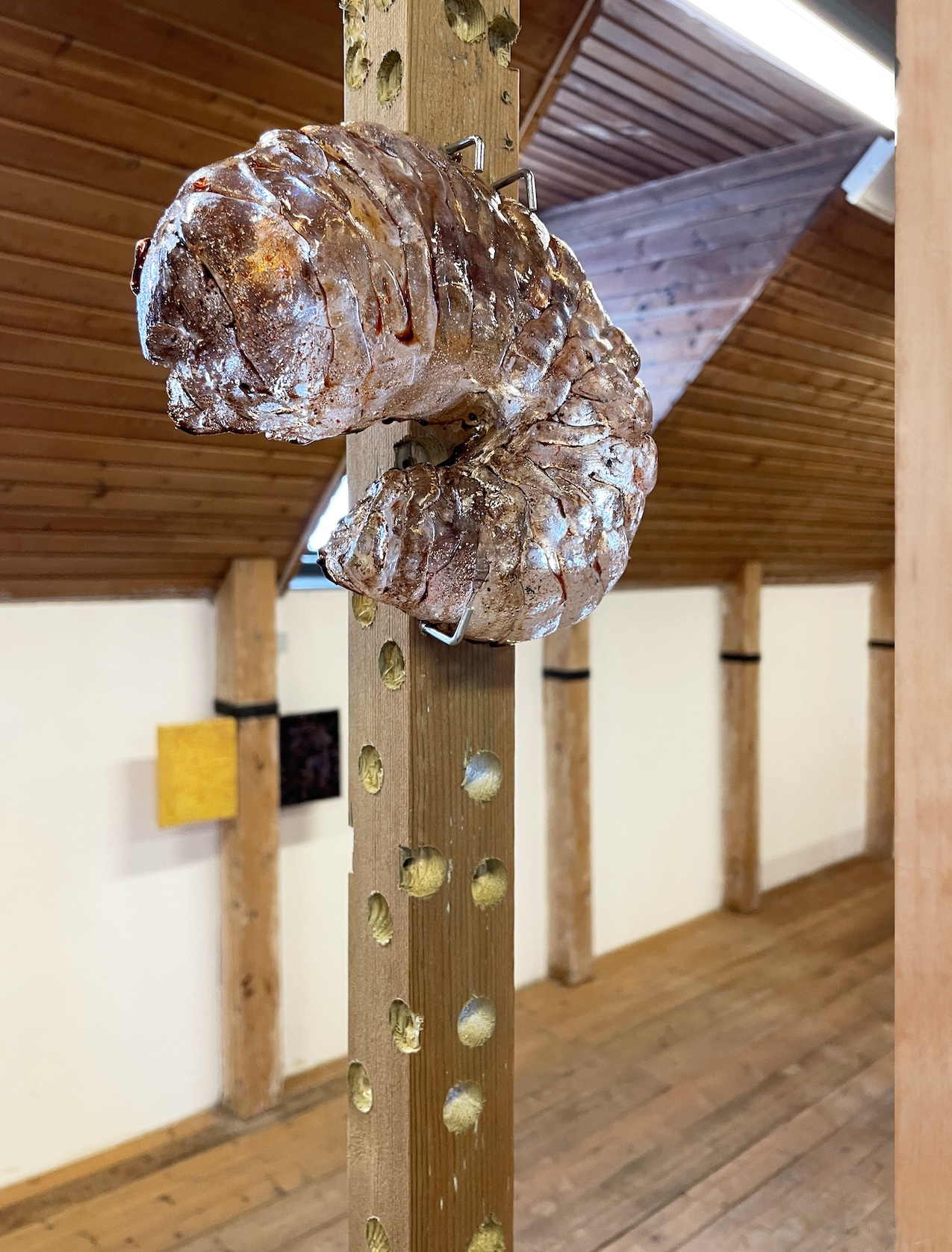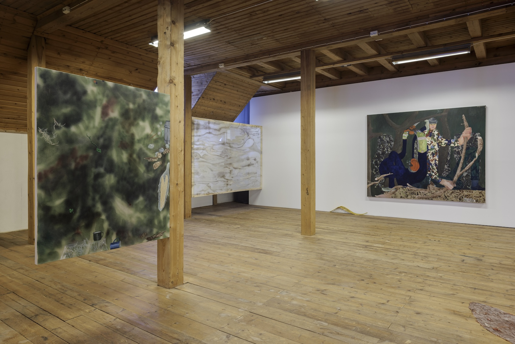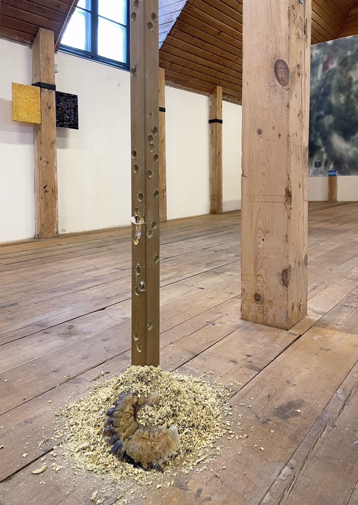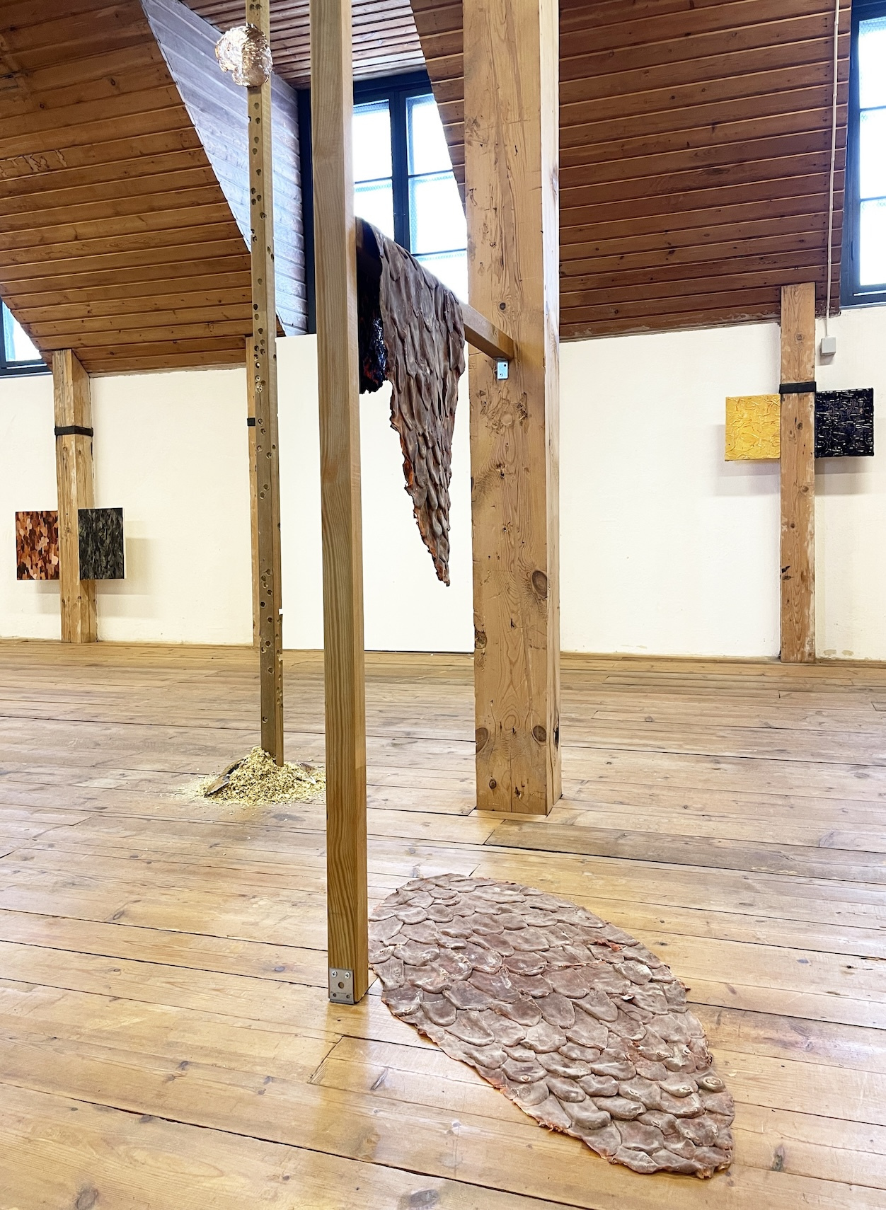 Kanto’s works act like a magnifying glass that presents us with all the materials that make up these interactions - pine needles, pinecones, tree bark, spruce bark beetles, plywood, plywood serving as skin, dried meat, chainsaws and loggers or foragers themselves as wood sculptures or painted figures. Kanto’s installation even engagement the exhibition gallery itself by making use of Havremagasinet wooden columns in creating an industrial forest, an immersive experience edged between capital and the spiritual.