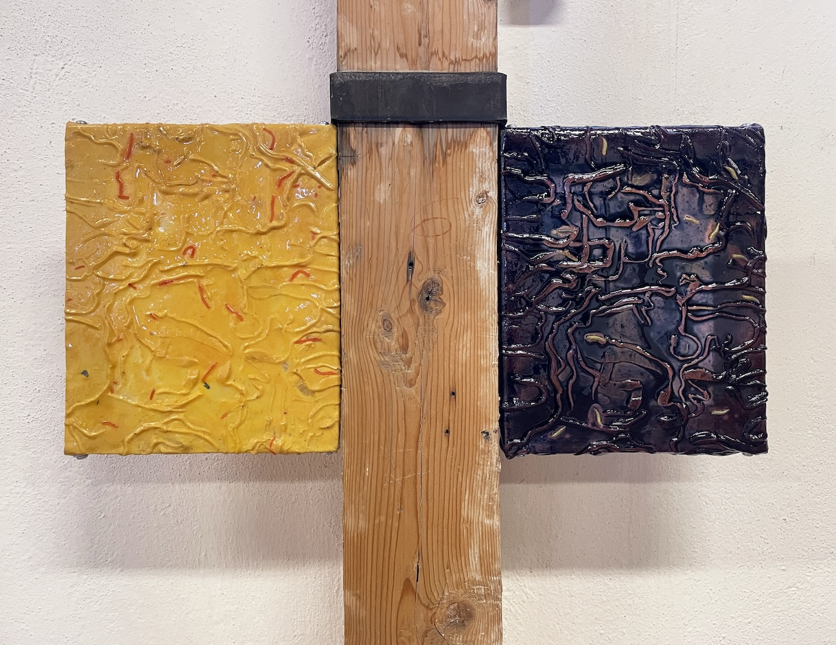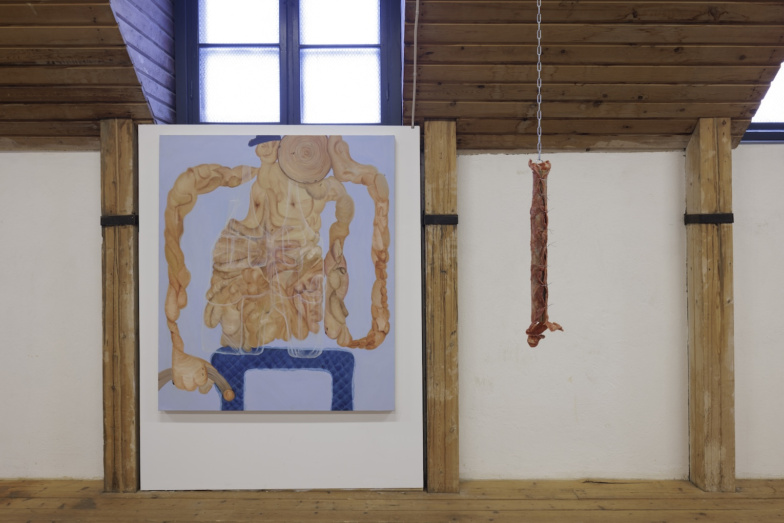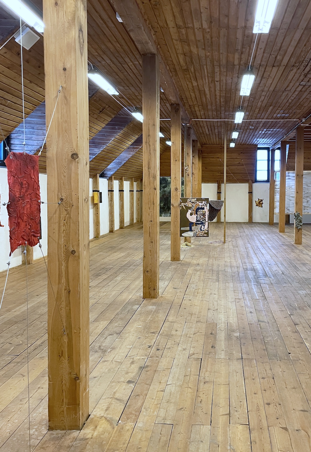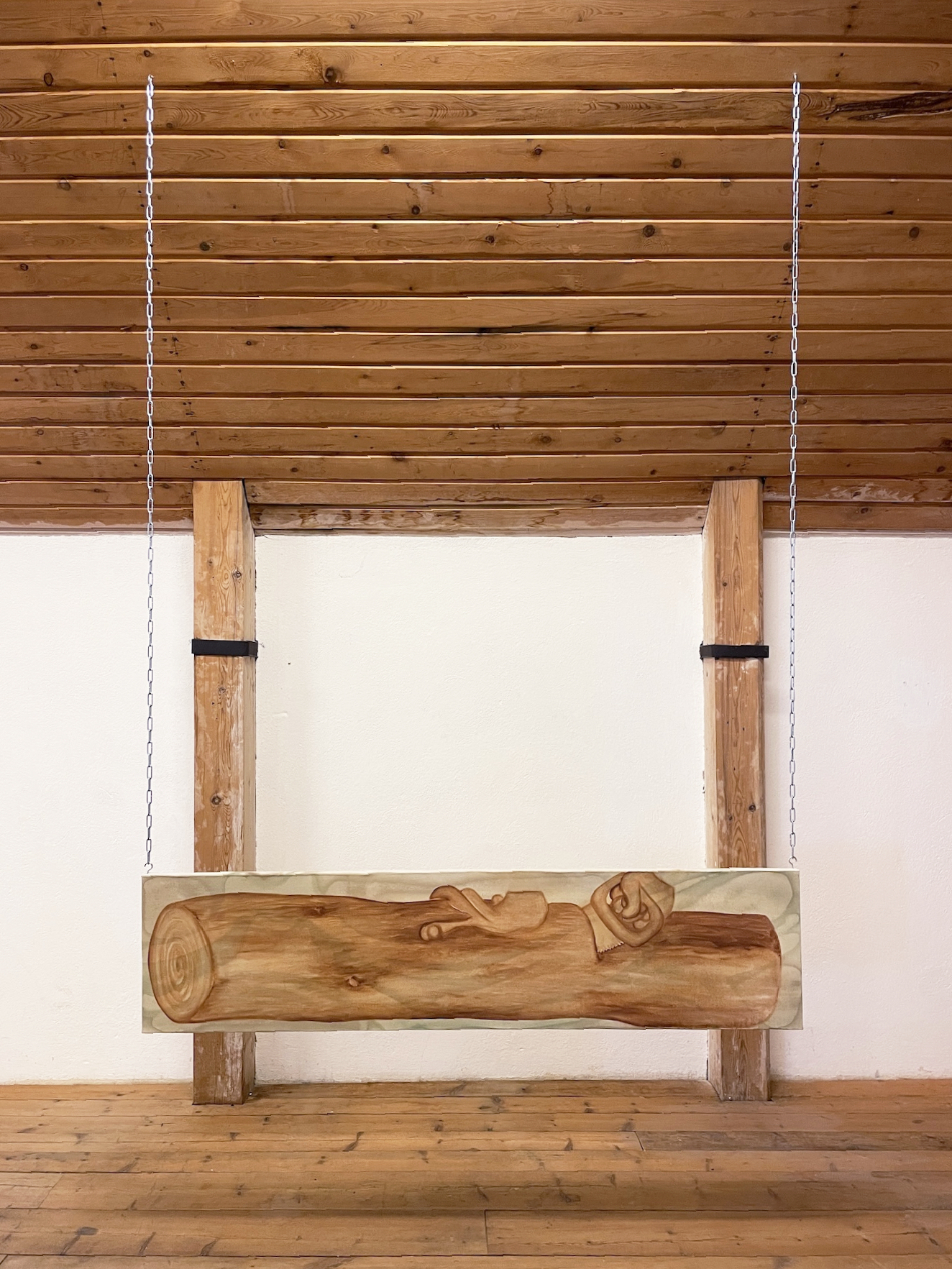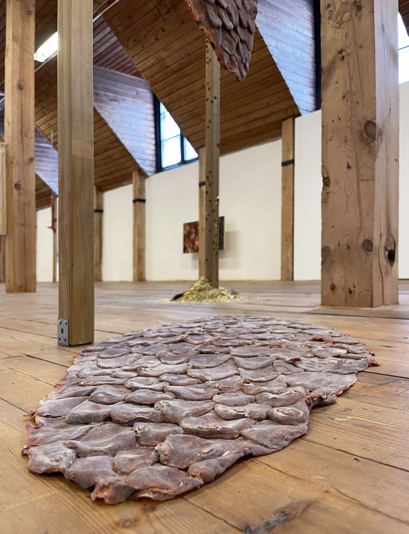 Kanto’s works act like a magnifying glass that presents us with all the materials that make up these interactions - pine needles, pinecones, tree bark, spruce bark beetles, plywood, plywood serving as skin, dried meat, chainsaws and loggers or foragers themselves as wood sculptures or painted figures. Kanto’s installation even engagement the exhibition gallery itself by making use of Havremagasinet wooden columns in creating an industrial forest, an immersive experience edged between capital and the spiritual.