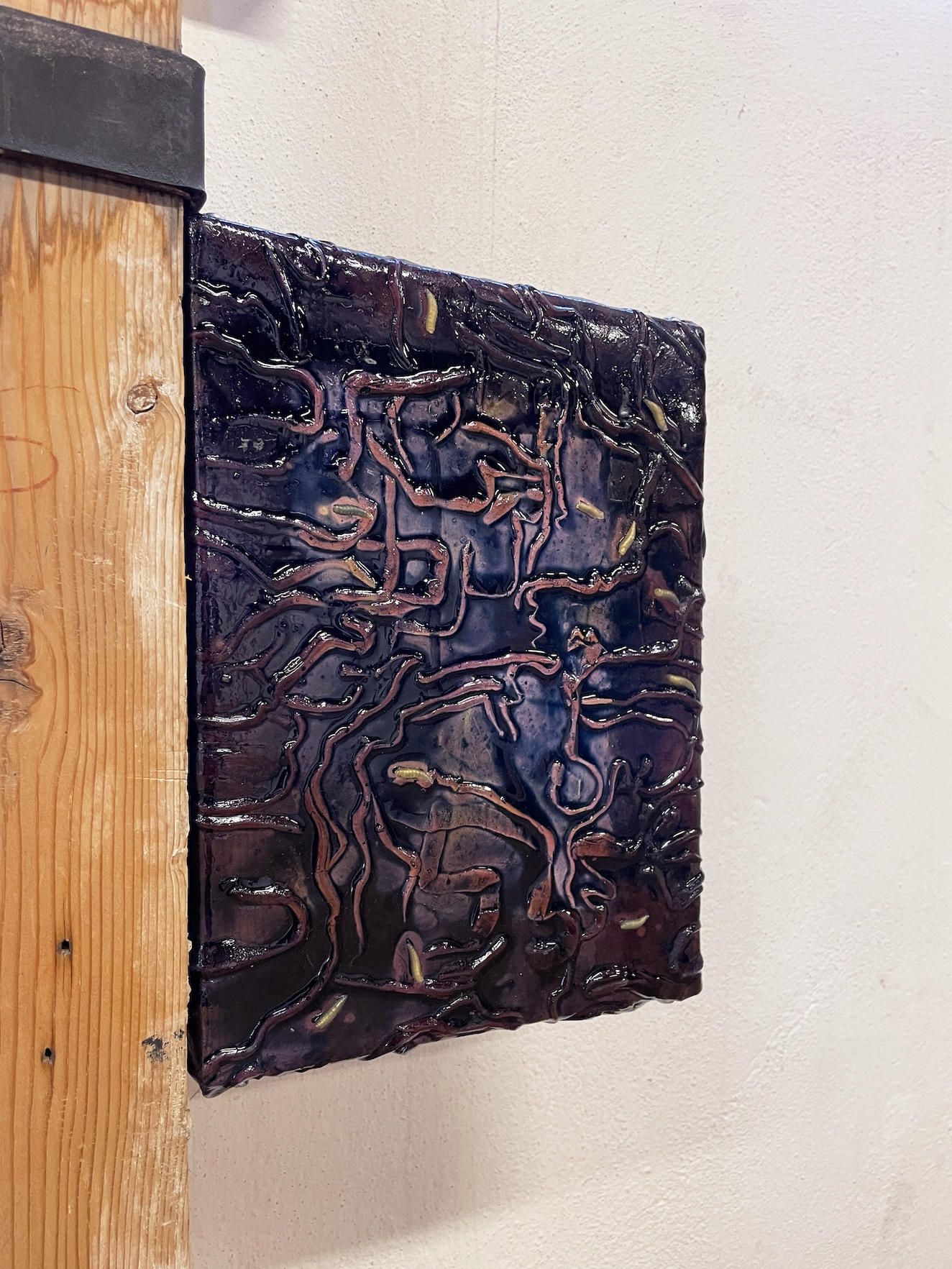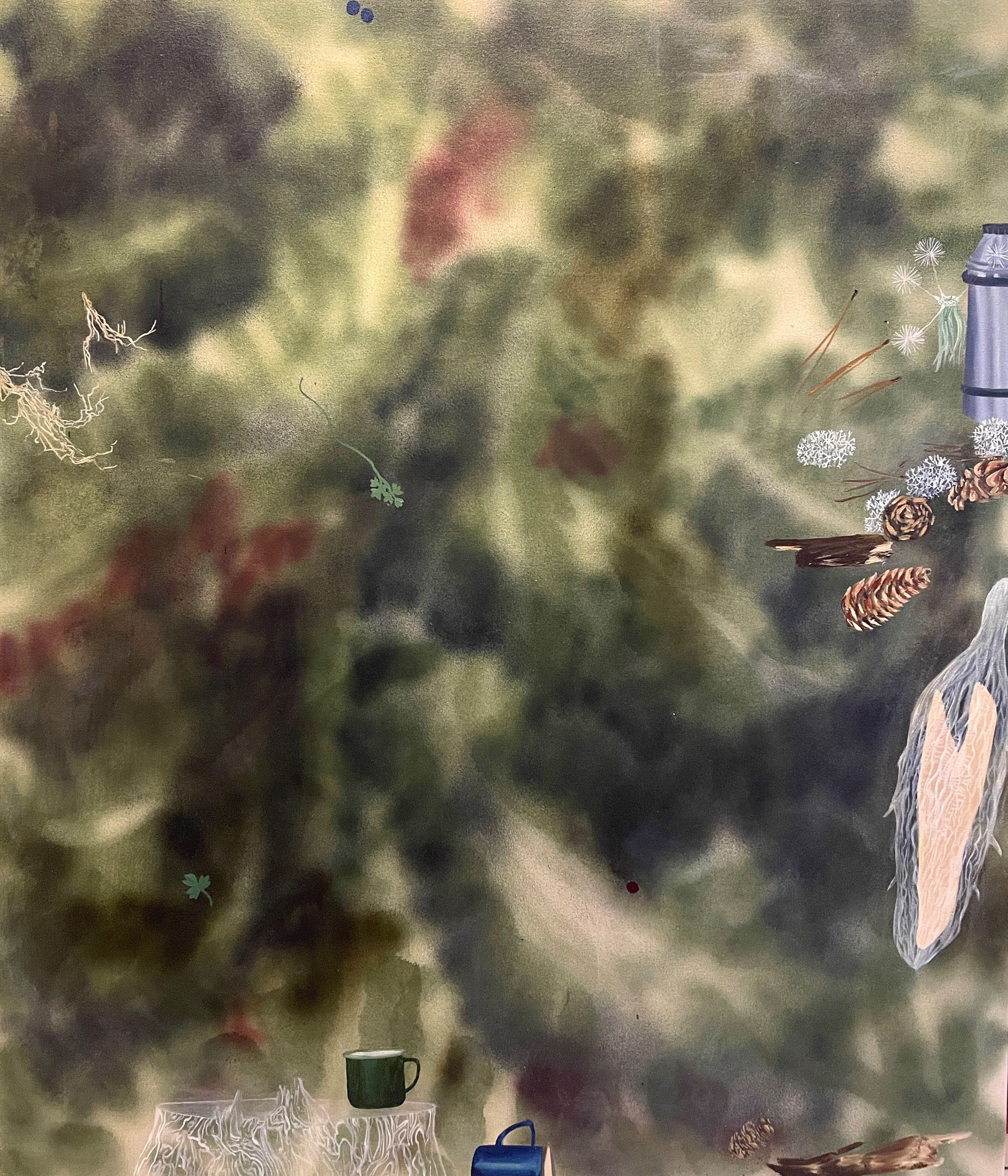The works on display here centers on her engagement with the different jobs and activities connected to the enjoyment of and use of variety of the resources the forest offers - foraging berries, mushrooms or timber, highlighting the role and the impact of the human presence has in nature, but also interfoliating this with the – ironic – encounter between the natural and the industrial, such as the extraction of timber performed by the logger and the “natural” extraction of the trees carried out by the bark beetles.