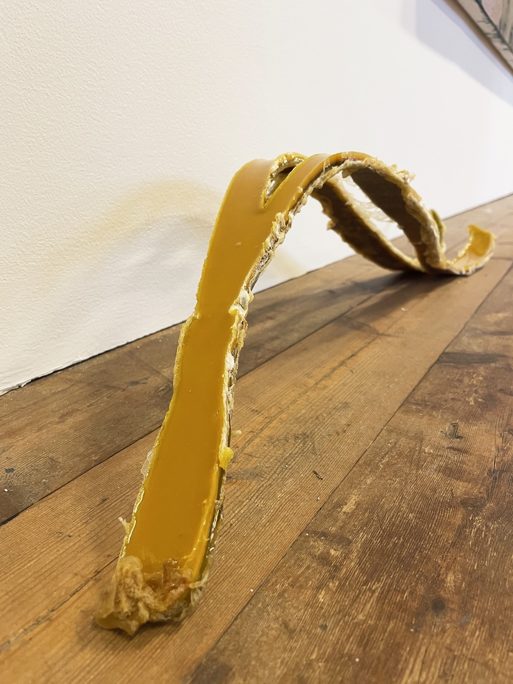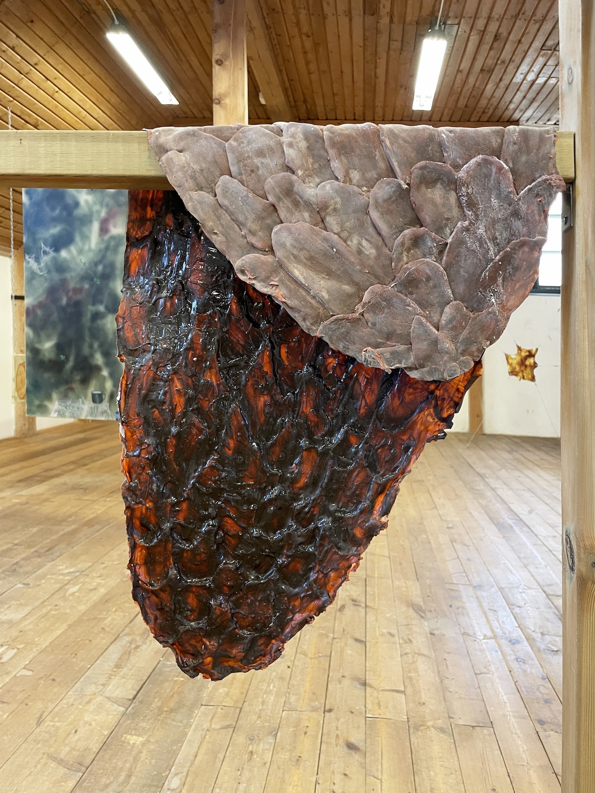 Hanna Kanto’s work is a collection of gestures regarding entanglements with “nature” explored in different materials and media, varying from latex and/or resin casting to oil painting and berry juice cooking. All elements that with great humor and insight are emphasized through the contrasting aspects Kanto brings forth, assembling and rendering visible the complexities involved in her native northern Finland ́s – not to say “our” – relationship with nature, ranging from worshiping its beauty, being grateful for the moments of peace and tranquility that it provides, as well as exploiting it as a way of sustaining our life style and the society of consumption we have constructed. Kanto’s works unfold all the contradictions and entanglements of this relationship: the spiritual, the mundane and vernacular, the industrial and/or exploitative, and all in-betweens.