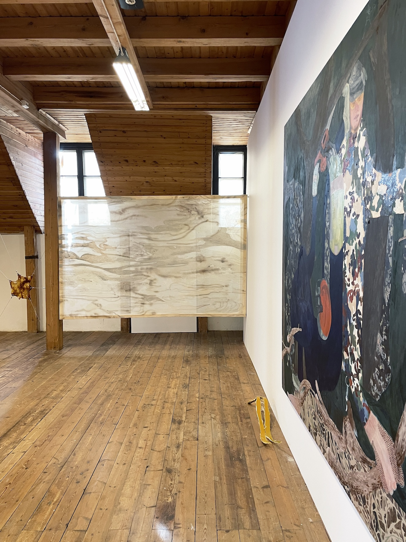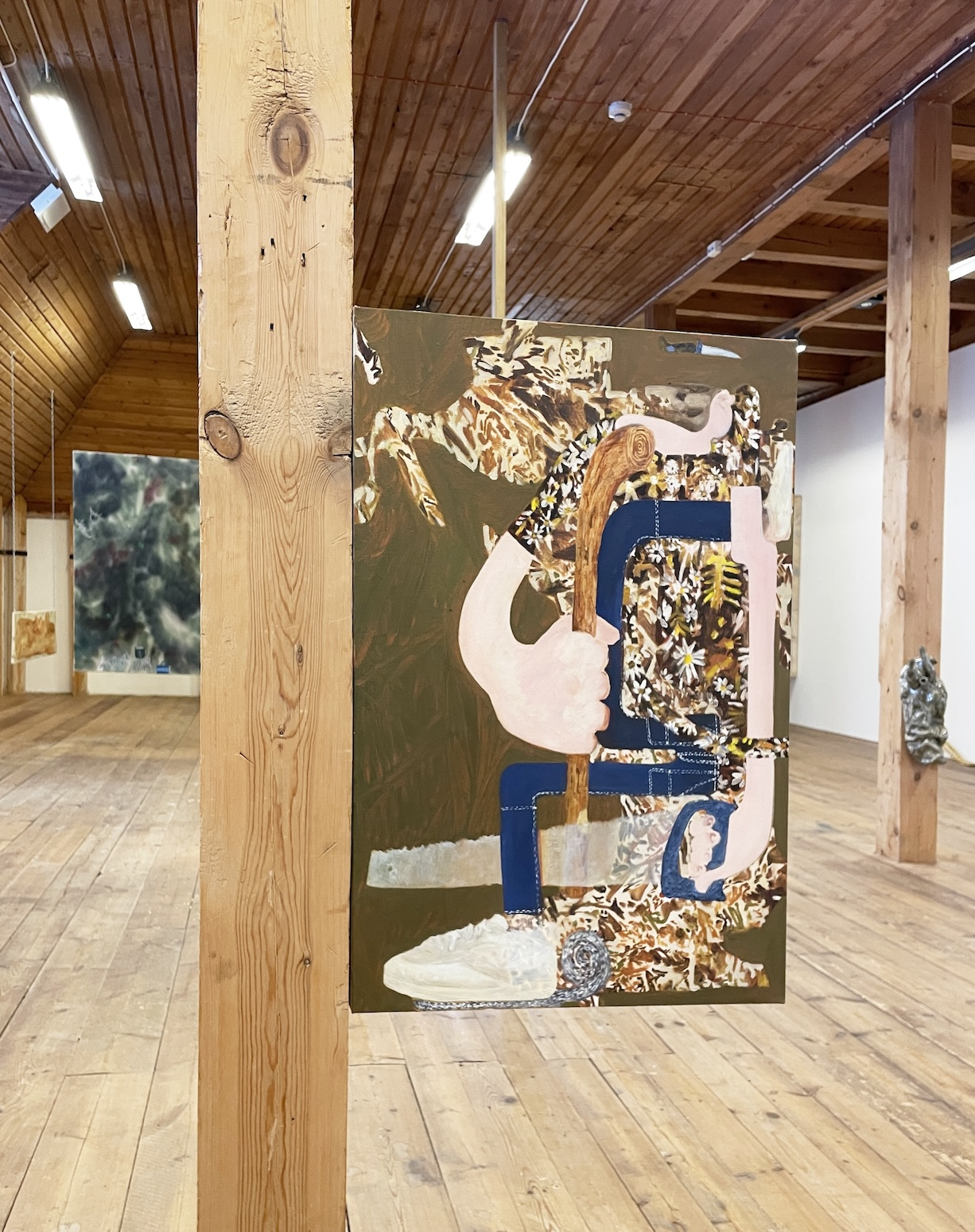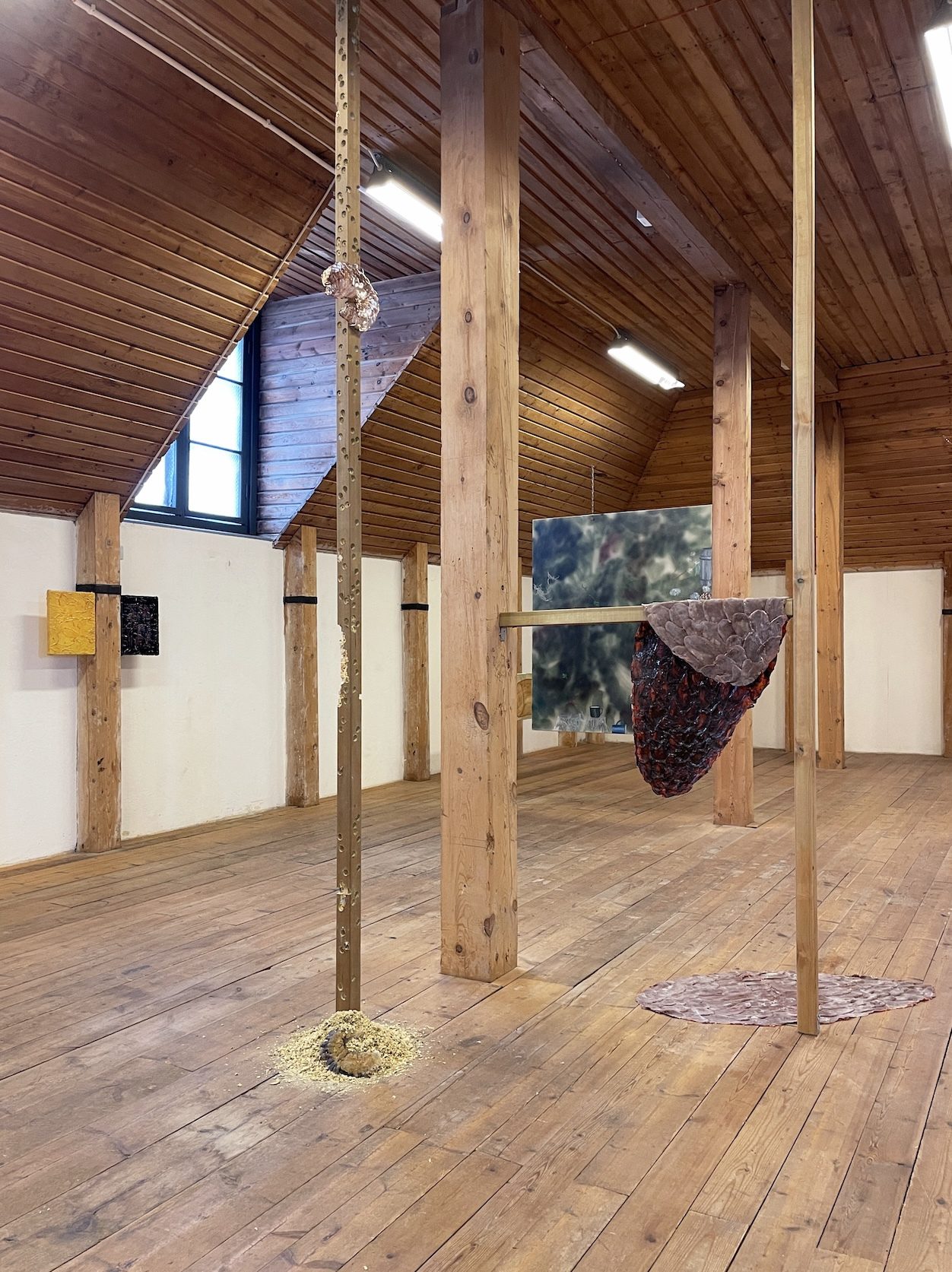 Kanto’s works act like a magnifying glass that presents us with all the materials that make up these interactions - pine needles, pinecones, tree bark, spruce bark beetles, plywood, plywood serving as skin, dried meat, chainsaws and loggers or foragers themselves as wood sculptures or painted figures. Kanto’s installation even engagement the exhibition gallery itself by making use of Havremagasinet wooden columns in creating an industrial forest, an immersive experience edged between capital and the spiritual.