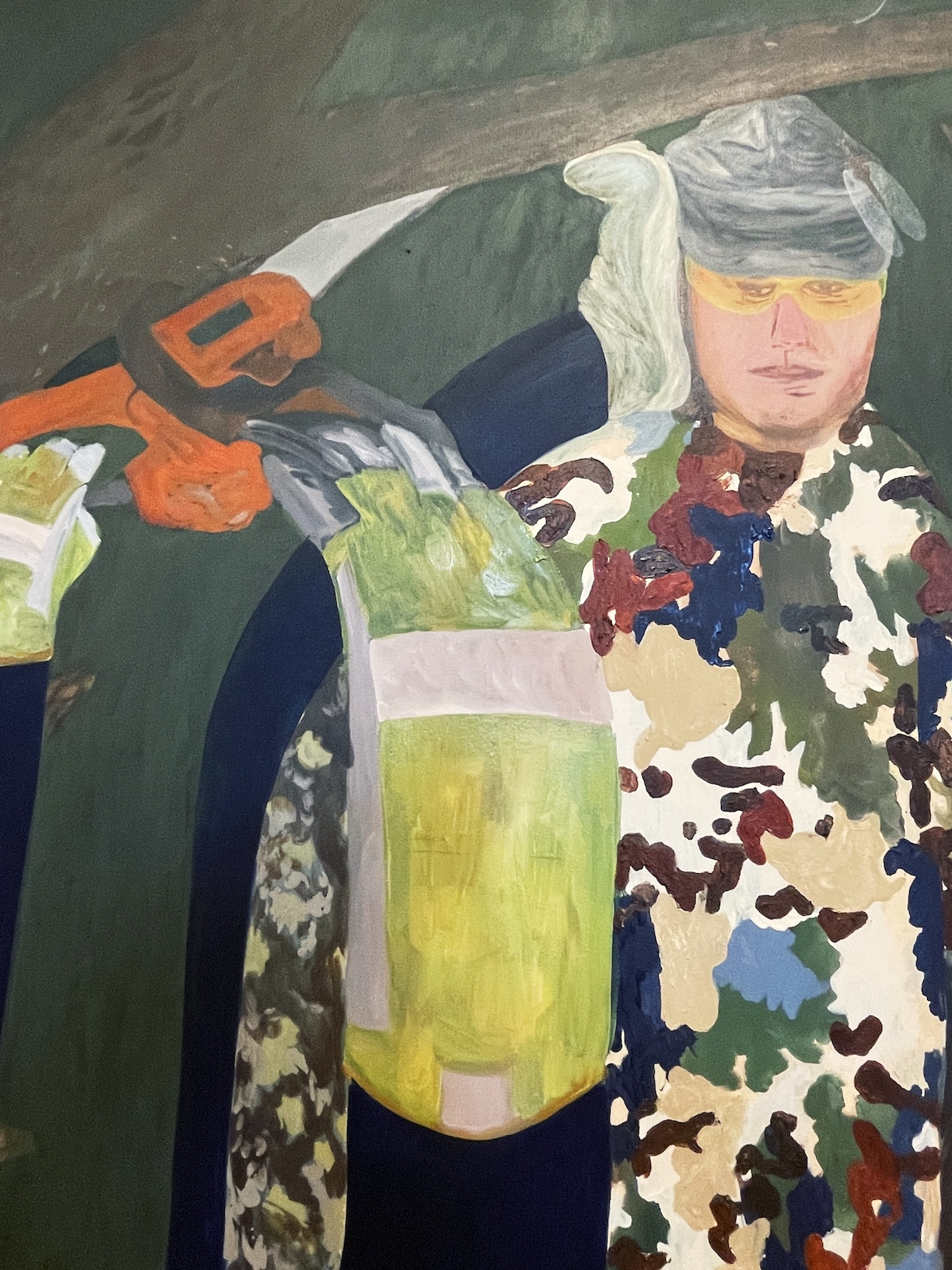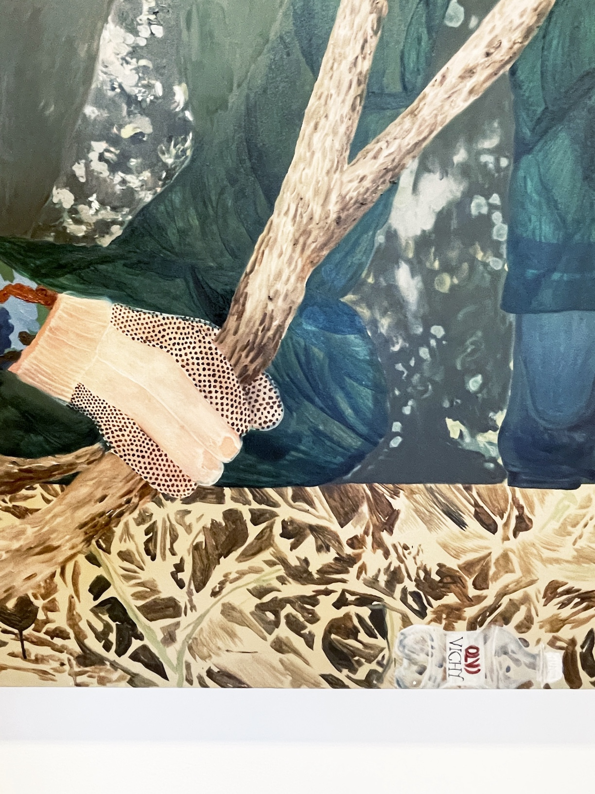 The works on display here centers on her engagement with the different jobs and activities connected to the enjoyment of and use of variety of the resources the forest offers - foraging berries, mushrooms or timber, highlighting the role and the impact of the human presence has in nature, but also interfoliating this with the – ironic – encounter between the natural and the industrial, such as the extraction of timber performed by the logger and the “natural” extraction of the trees carried out by the bark beetles.