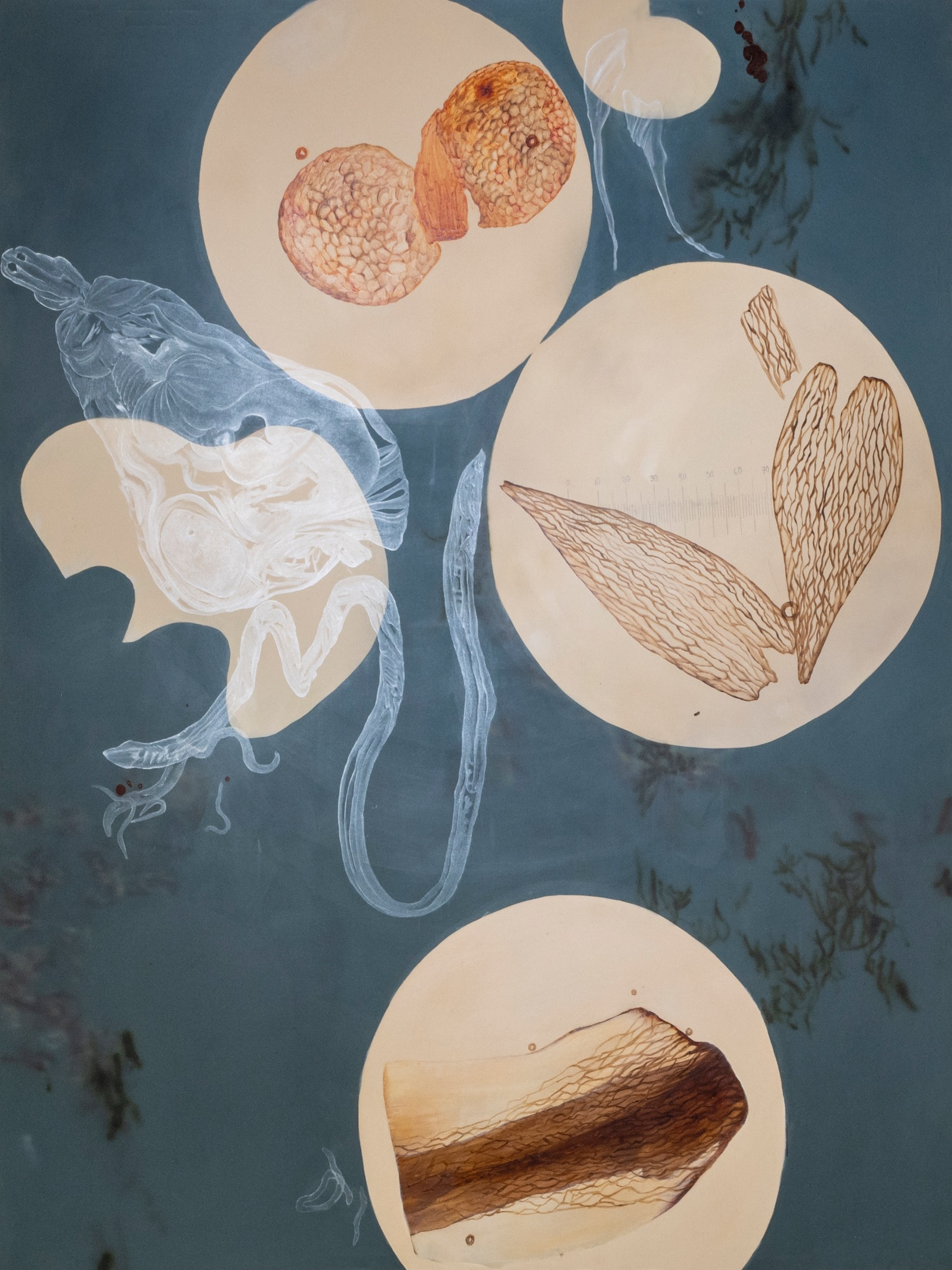 In the artwork, you can see a researcher’s table and microscopic images of different moss species. In addition to the visible real world and the microscopic world of organisms, a strange and uncontrollable future is present in the work. As the climate warms and the permafrost thaws, bacteria are revealed from under the palsa covers, which are no longer held by the microscope’s lenses. The three-dimensional dimension is brought into the work with ceramic organisms or organs that symbolize the earth as a living, breathing organism and the rich bacterial population it contains. Above all, the work reflects concern for our endangered arctic nature.