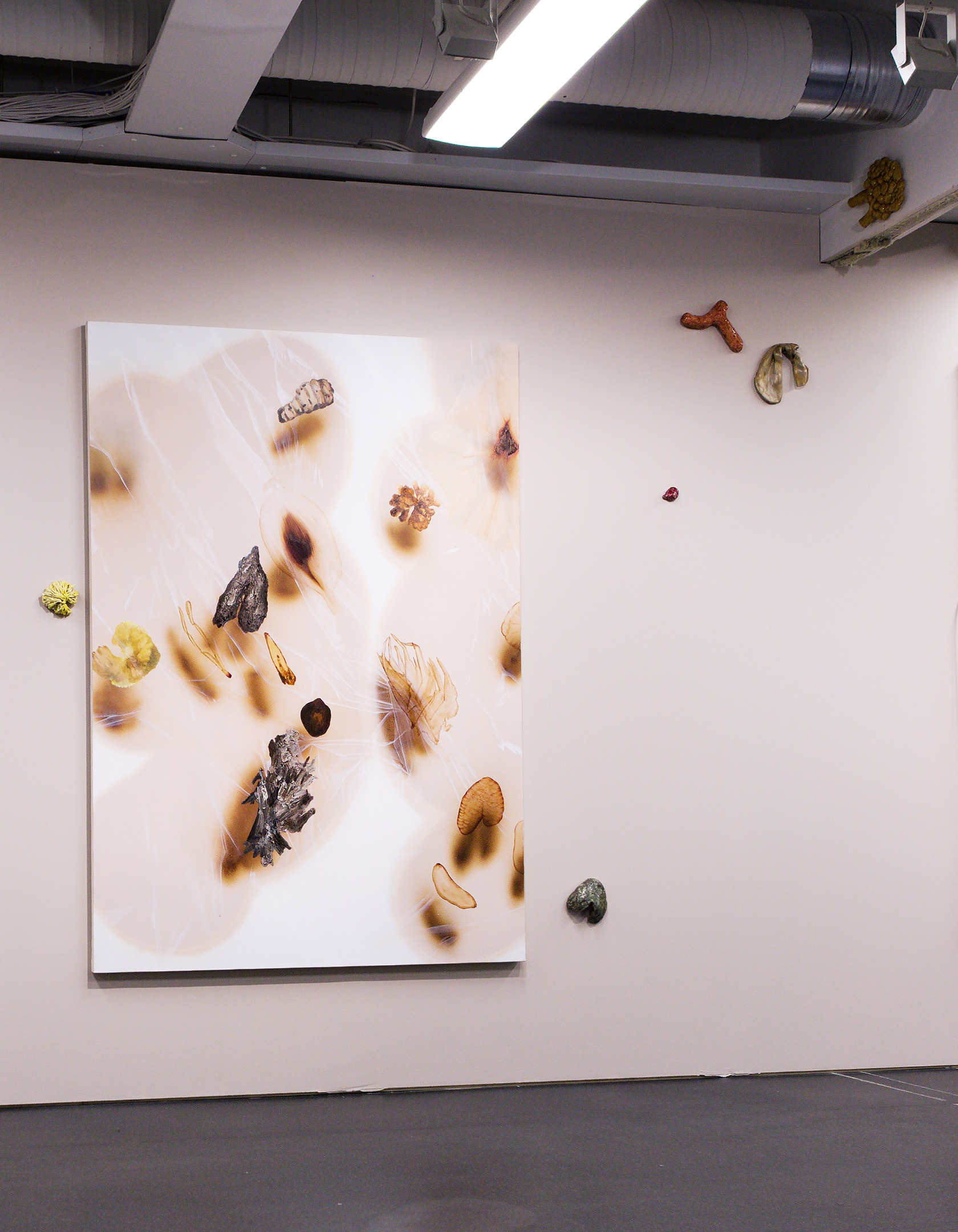 250x145cm, acrylic and oil on canvas, plastic, glazed stoneware